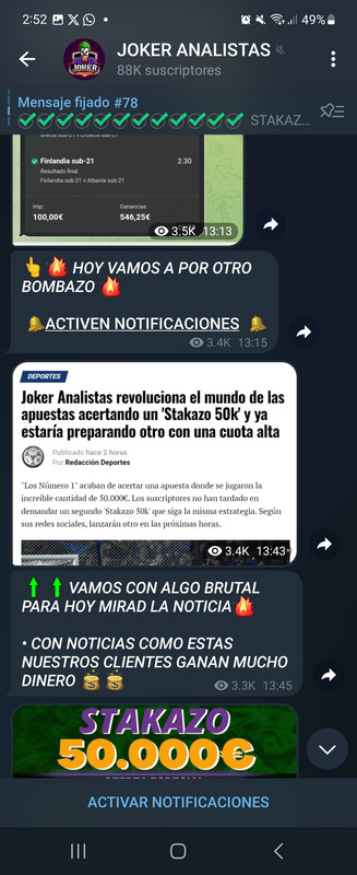 Volviendo al canal principal solo se ve que manda apuestas ganadas, nunca pierde, aunque la realidad es otra. ¿Apuestas de 50.000 euros stake 10? Si es un poco inteligente dudo que las haga, otro engañabobos más, las realiza, captura, subida al canal, cierra apuesta y si apuesta tick verde editando la captura previa y al canal a fardar de éxito rotundo (aunque ojo que esto es una opinión personal, a lo mejor es tan necio de apostar 50.000 euros sin ningún tipo de conocimientos más que el de engañar al cliente). Imagenes de noticias de «internet» qué le dan la razón, obviamente imágenes que ha editado el mismo)
