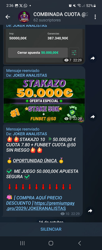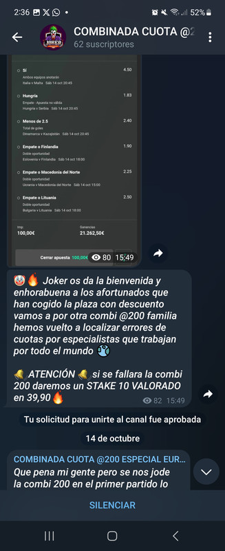 Comencemos, al entrar en el canal, lo primero que llama la atención es que nunca falla según lo que puedes ver en el propio canal (cosa que debería echarte ya para detrás) pero bueno quizás sea un iluminado. Tras unos cuantos días viendo publicaciones constantes sin parar de gente agradecida y de megacuotas que saca a diario a la venta ( en torno a 4, que llegan a un promedio de 48,50 euros de media al dia en caso de contratarlos todas) me decido a empezar a suscribirme y ver las susodichas apuestas.