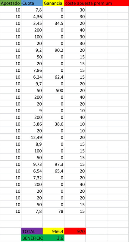 Siguiendo con datos, aquí tenéis un Excel abreviado y simplificado (ya que son 3 meses de datos) de 30 apuestas premium correlativas en el tiempo dia a día, equivalente a un mes natural apostando a diario con el 10 euros a cada apuesta premium: